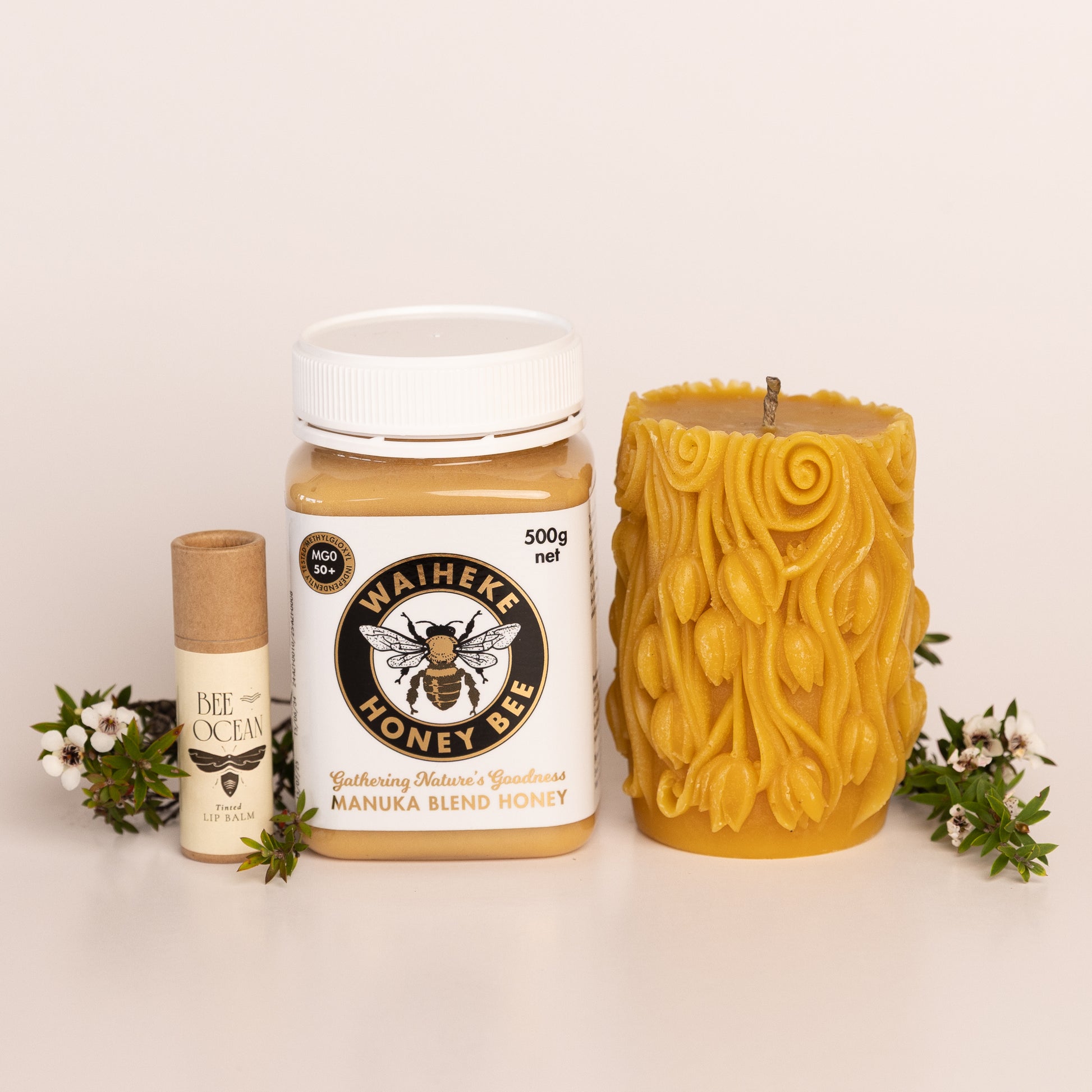 500 gram manuka blend Honey (mgo 50+) , 240 gram beeswax Candle and pink tinted natural lip balm
